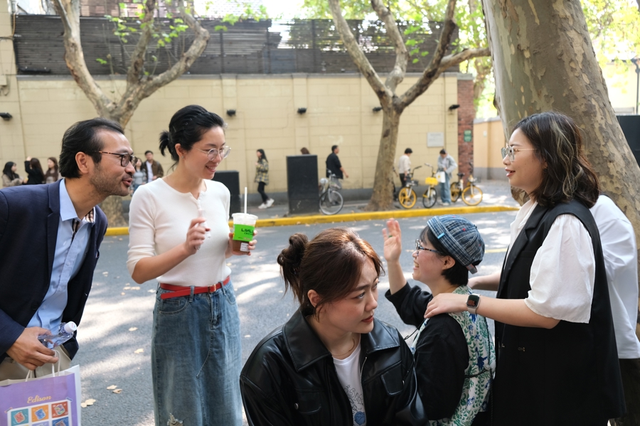 张洁(右一)带领青年艺术家、故事商店“店长”们游览愚园路。受访者供图