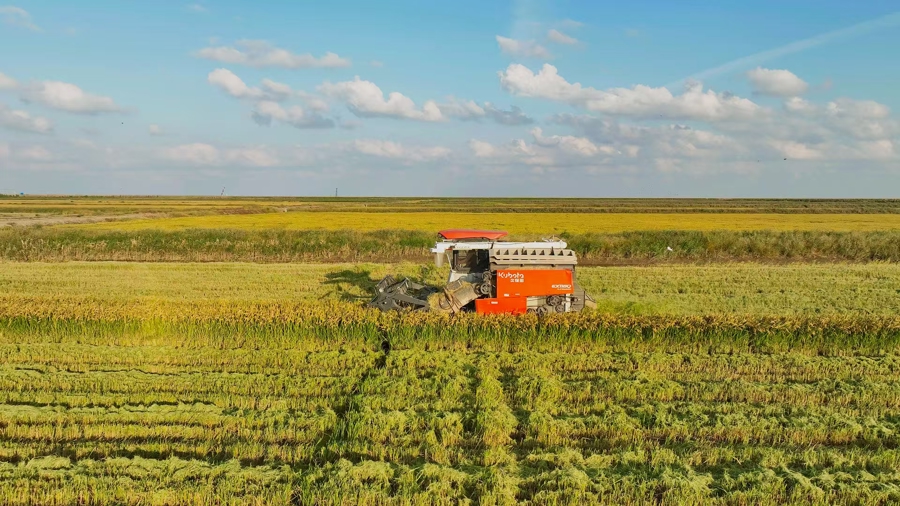 秋风拂过沃土,横沙新洲的金色稻浪里翻滚着丰收的韵律。